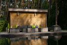 Zwemvijver in EPDM-folie met afboording in blauwe hardsteen en Poolhouse in Eik & Thermowood